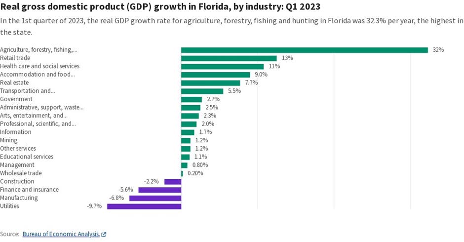 As seen in the chart above, the sectors fuelling massive growth in Florida comes predominantly from Agriculture, Retail trade, and Health Care and Social Services. “A 2021 analysis of U.S. Census data by the policy research firm KFF found that immigrant workers lacking permanent legal status made up 37% of all agriculture workers, 23% of construction workers, 14% of service workers and 14% of transportation workers” and an aggregate of 11% of the labour force.