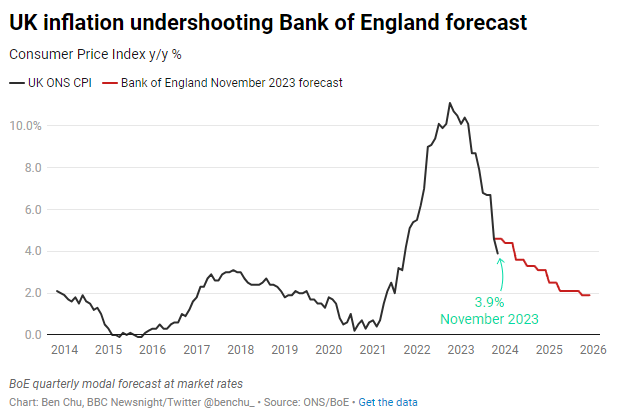 The BoE expected inflation to average 4.6% in Q4 of last year. What data showed however, is UK inflation at 3.9% in November and if the trend continues, I believe the inflation target of 2% could be hit as early as Q2 of 2024!