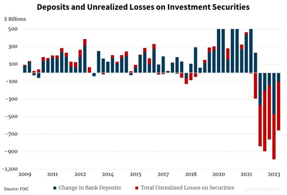 Unrealized losses on investment securities held by US banks is now at $558 billion, up 8.3% from the previous quarter. In addition, bank deposits have also declined for a fifth consecutive quarter.