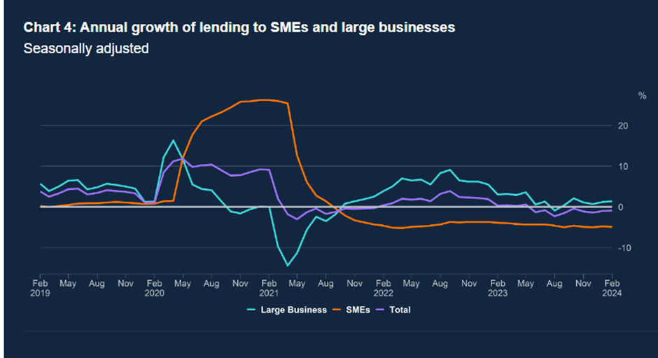 Effectively, businesses have been repaying loans since September 2021,and until this changes, it is hard to forecast any sustainable growth in the business sector. Although there are some signs that manufacturing activity bounced back in January, it’s only sustainable if there’s an investment taking place to grow productivity and output. Part of the reason is that borrowing costs for SMEs remain high. The average price of new borrowing from banks and large firms fell four basis points in February 2024 to 6.97%. However, the rate of new loans to SMEs increased by five basis points to 7.55. . In 2023 SMEs employed 16.1 million people, which accounted for 61% of employment in the private sector. Addressing this issue is therefore key for the UK to get back to growth.